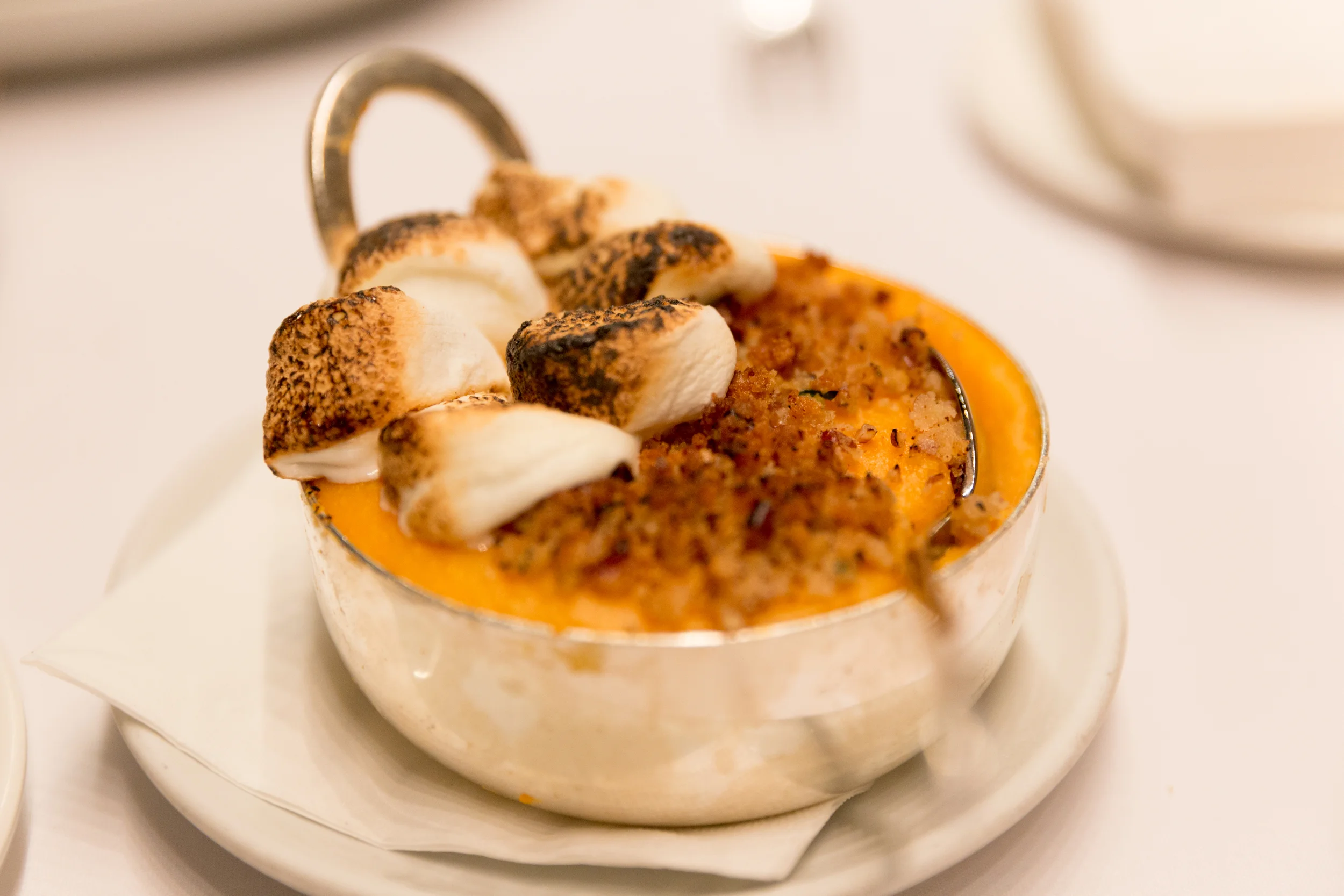 On the side was sweet potato casserole with mashmellows and pecan nuts.